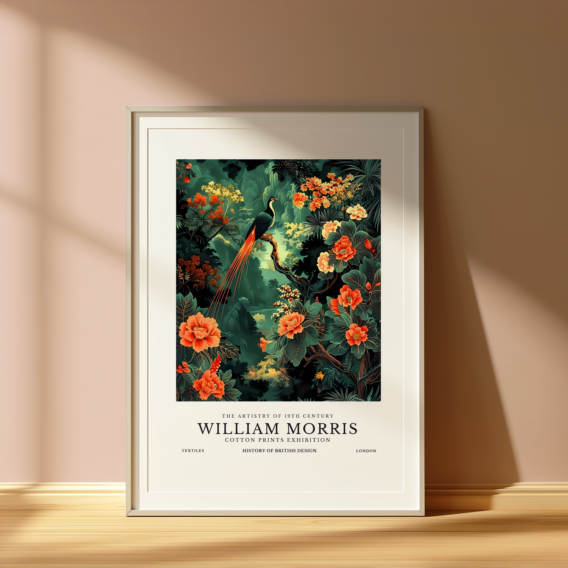 Add a statement of historical elegance to your space with this premium gloss art print inspired by the legacy of William Morris and the Arts & Crafts movement. Featuring a majestic tropical bird perched amidst lush Victorian-style florals, this design evokes the richness of 19th-century British textile exhibitions with a contemporary fine art twist.